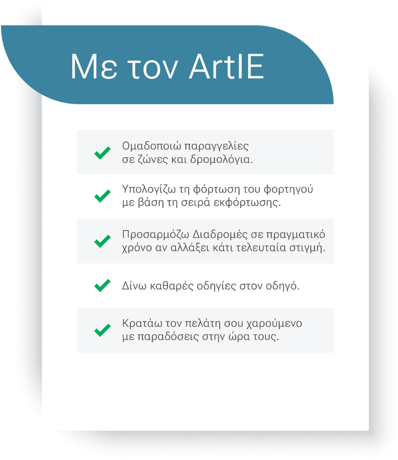 - Σε βοηθάω να έχεις βέλτιστη χρήση στόλου με περισσότερες παραδόσεις σε λιγότερα χιλιόμετρα.